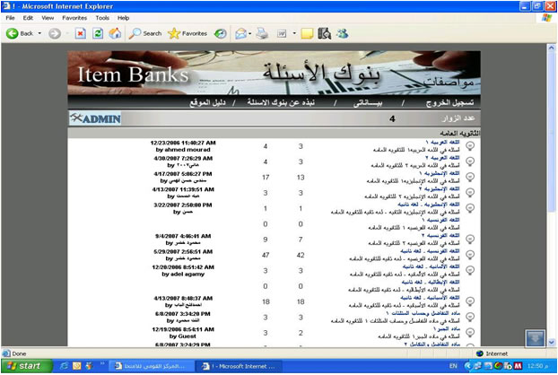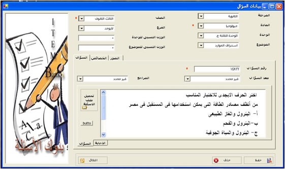 تم عمل تجربة منظومة لبنوك الاسئلة وتم ادخال مادتي الكيمياء والبيئة والجولوجي للصف الثالث الثانوي،ويقوم البرنامج بتخزين الاسئلة ومواصفاتها واستخراج أكثر من صورة امتحانية متماثلة طبقاً لمواصفات الورقة الامتحانية