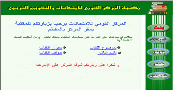 تم عمل برنامج للمكتبة الخاصة بالمركز وتم ادخال العديد من الابحاث والكتب والرسائل العلمية والدوريات وتوصيله على الشبكة الداخلية للمركز حتى يستطيع أي باحث عمل بحث عن كتاب معين أو رسالة معينة دون الحاجة إلى النزول ألى المكتبة كما تم توصيلة بالعديد من محركات البحث التربوية عن طريق الانترنت